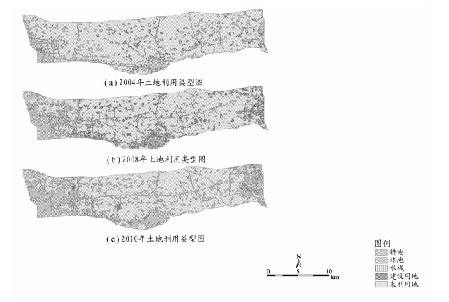 从2004年至2010年,耕地是研究区内的主要土地利用类型,且减幅最大,6年间共减少了76.45 km2,降低了15.08%,其中绝大多数转变为建设用地,但占总面积的比例均在65%以上;建设用地增加最多,共增加78.79 km2,所占比例从16.18%上升至28.98%。整体上说,研究区耕地在减少,而建设用地在增加,林地、水体和未利用地由于面积和比例较小,数量上变化不大。