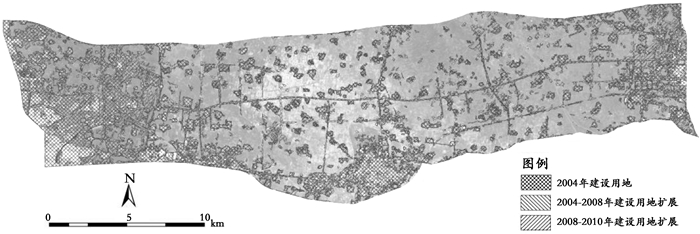 (二) 建设用地扩展的空间演变通过叠加研究区2004年、2008年、2010年的土地利用现状图,得出研究区建设用地的空间扩展(图 2)。