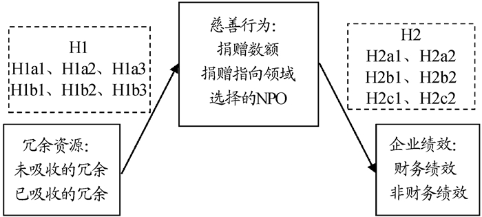 一、 研究假设和概念模型 (一) 冗余资源与慈善行为冗余资源(Slack Resource)被视为“一种过量的、能随意使用的资源”[2],它能够使组织成功地应对内部调整和外部政策改变的压力,以适应外部环境而进行战略变革。根据冗余的不同状态可将其分为“已被吸收的冗余”和“未被吸收的冗余”[3],前者是指组织内部的超额成本,较难进行重新分配,如被纳入组织进程的原材料存货、熟练劳动力、柔性较低的设备多余能力;后者是指目前自由的、不受约束的资源,较易分配到其他部门和业务,如现金、现金等价物、原材料存货、有价证券等。在以往的研究中冗余资源常被用来解释目标冲突、权力斗争行为、效率以及创新[1, 4-5]等不同的组织现象,现在则越来越多地倾向于探讨其积极作用的发挥。冗余资源能够使组织从容应对外部环境的动荡和冲击,有助于组织战略的调整,从而改善公司的业绩,可称之为“环境变化的缓冲器”。以构建社会资本、建立企业声誉、获取竞争优势为主要目标的慈善公益活动已经成为当今企业重要的战略决策之一。近年来,企业慈善蓬勃发展,已成为不可阻挡的历史潮流。慈善支出金额、慈善指向领域和选择的非营利组织等维度可以清晰地反映企业慈善行为的特征和结构。