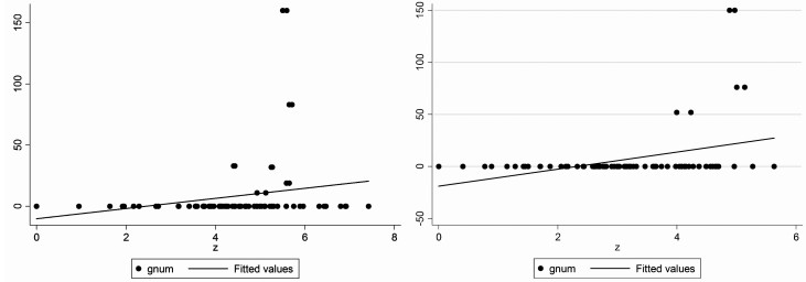 图 1 高铁和城市联系指数的关系 (左图为广州,右图为深圳) 资料来源:笔者绘制。 |