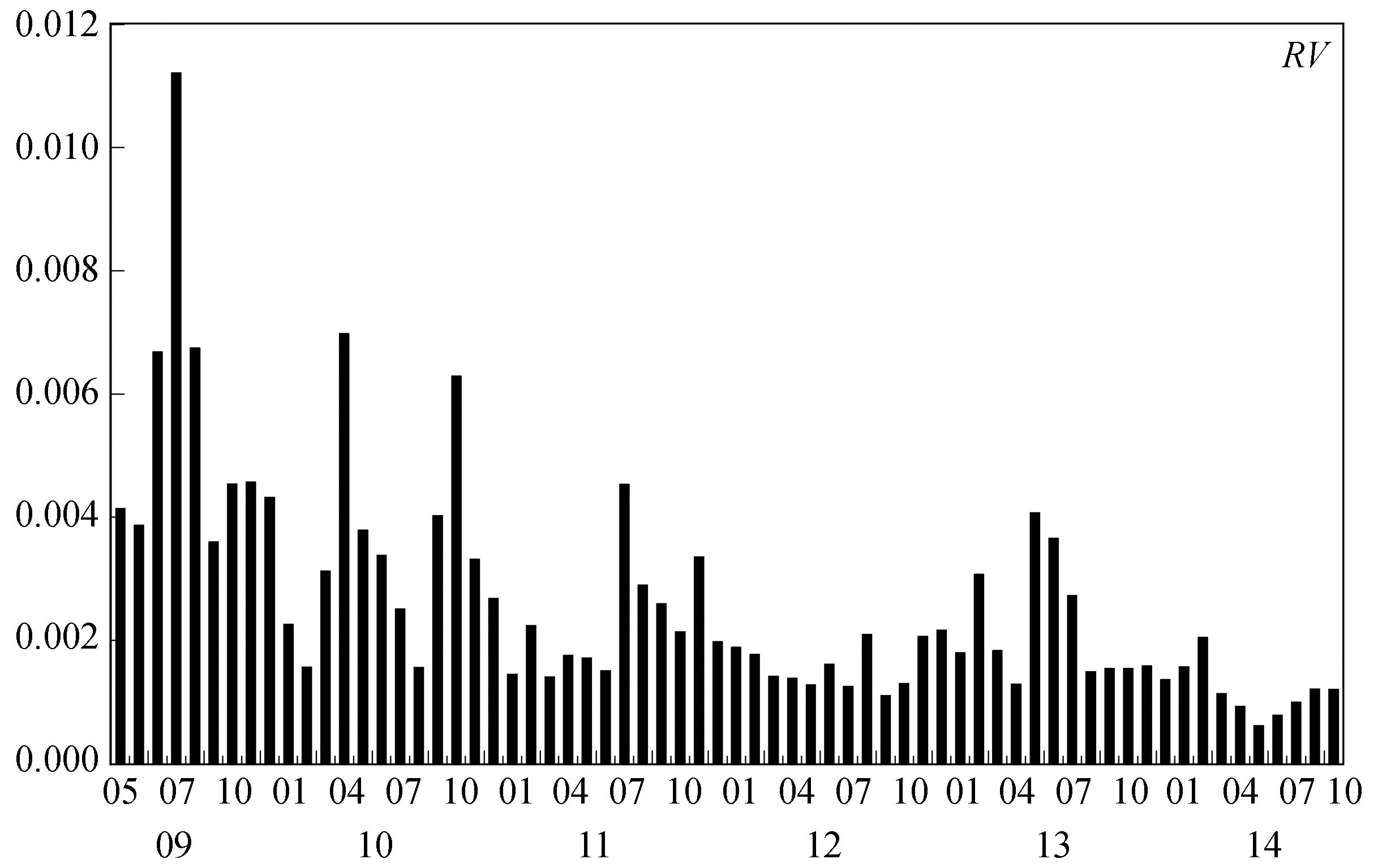 三、实证模型的改进为反映一个持续时间段内的整体趋势,我们对上述基于高频数据估计的RV,BV和RJ等日度数据在月内求和,得到月度数据,用月度变量来建立模型,用下标t表示月度频率。