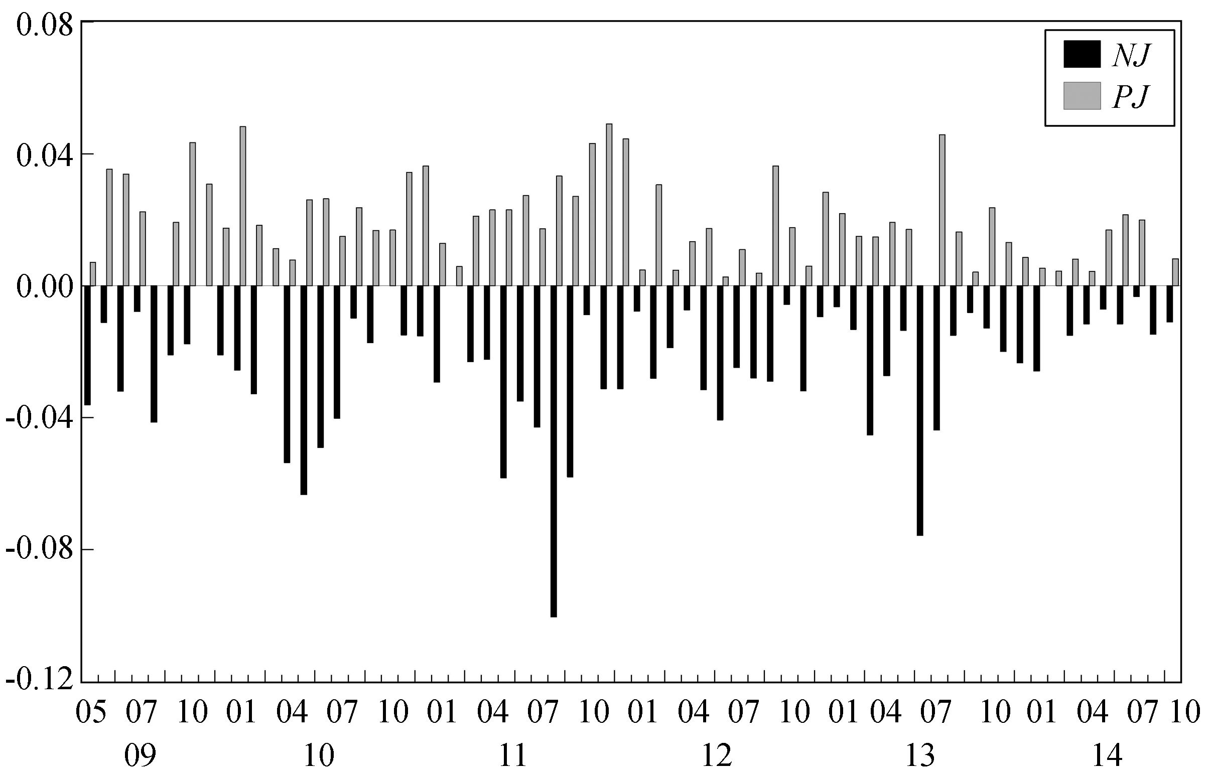 其中PJt表示第t月正向跳跃的月度变量;NJt表示第t月负向跳跃的月度变量。