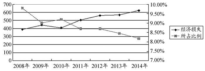 图 2 2008-2013年商业银行员工因玩忽职守造成的经济损失与总经济损失比例(单位:亿元人民币) 注:经济损失包括直接经济损失和由此造成的银行呆坏账。 |