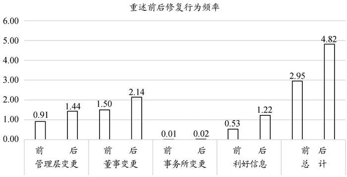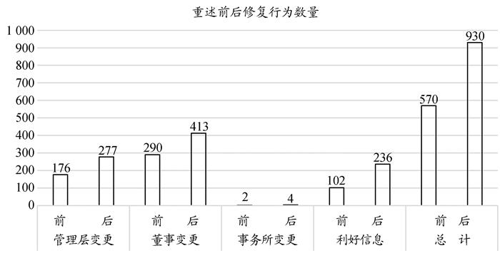 研究采用了管理层变更、董事变更、会计师事务所变更和公布利好信息4种修复行为,分别对193家样本企业财务重述前后采取以上修复行为的数量和频率进行统计。