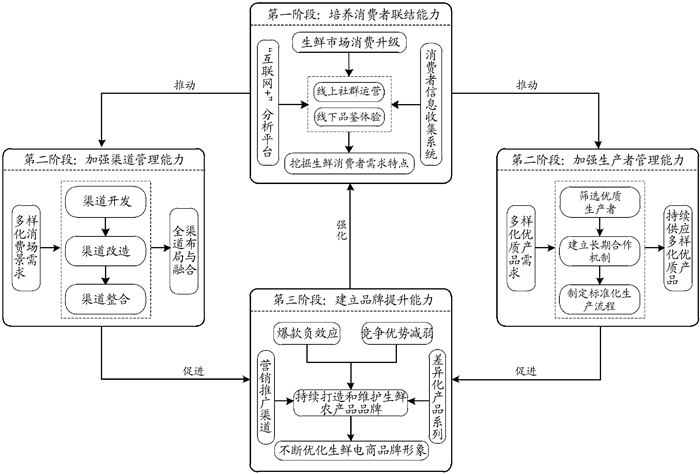(一) 消费者联结能力推动生鲜电商渠道管理能力和生产者管理能力的形成消费者联结能力是指生鲜电商加强与消费者的互动沟通、建立并维护与消费者的联系从而挖掘消费者需求特点的能力。随着生鲜消费市场的逐渐成熟,一方面,消费者对价格补贴的敏感度降低,更加注重产品品质和消费体验;另一方面,消费者不仅有产品需求,还有购买便利、售后服务等服务需求。在通过生鲜爆款吸引消费者尝试性购买后,如何维护已有消费者并进一步扩大消费群体是生鲜电商首先需要解决的问题。在“互联网+”环境下,通过建立线上沟通社群,生鲜电商持续为消费者提供烹饪方法、选品技巧等专业性内容,并开展社群活动加强与消费者的沟通,在维护消费者关系的同时激发消费者需求表达和口碑传播。同时,举办产品品鉴、美食沙龙等线下活动增加消费者与消费者面对面沟通交流,在获取消费者意见的同时提高消费者对企业的认同感。在此基础上,基于“互联网+”分析平台和消费者信息收集系统,生鲜电商对消费者行为数据和需求进行精准分析,从而形成消费者联结能力,精准洞察消费者需求特点。有效的消费者联结是生鲜电商在变化的市场环境中形成动态营销能力的起点,一方面,消费者多样化消费场景需求推动生鲜电商开发、整合不同渠道资源,另一方面,消费者对多样化优质产品的需求推动生鲜电商选择、管理生产者资源以持续供应优质产品。