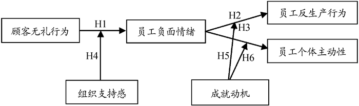 综上所述,本研究利用情感事件理论及资源保存理论的研究成果,将员工的负面情绪视为中介变量,将组织支持感和成就动机作为调节变量,构建顾客无礼行为对员工反生产行为和个体主动性影响机制的概念模型,如图 1所示。