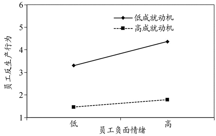 (五) 成就动机的调节作用McClelland指出成就动机是一种在追求卓越这一目标下,个体习得的追寻成功的内在需要或内驱力[47]。成就需要越强烈的人越希望成就更完美的事业,追求更大的成功,沉醉于为了获取成功而奋力拼搏的乐趣及获取成功后个体的成就感。成就动机作为个体在完成任务过程中的一种内部推动力,代表的是个体特征中的行动趋势部分,反映出个体在进行一项行动过程中的关注点[48]。有研究指出,个体成就动机的差异对其行为方式、绩效水平、责任感高低及其与合伙人之间的融洽性均有显著影响[49]。Frese和Fay也指出了个体主动性与成就动机显著相关[40]。有研究指出个人的责任感与反生产行为倾向负相关[50],成就导向作为责任感的重要特性之一,也具备相同的属性[51]。积极的人格特质有利于减弱由资源缺失带来的消极结果,弥补自身损耗的自有资源[18],表现为人的进取精神、事业心等。个体成就动机的差异会造成个体的不同,成就动机较高的个体更倾向于挑战具有较高难度的目标,克服阻碍圆满完成工作要求,而成就动机较低的个体则在障碍面前更倾向于退却且会产生不愉快的情绪[52]。成就动机的实质是一种个体的高级需求及内在需求,同时也可以被理解为个体产生自信的动力机制。已有研究指出,成就动机能预测个体的自信程度。具体来说,成就动机越高的个体自信程度越高[20]。而自信作为个体内部所具有的资源能够帮助个体缓解由于外部压力产生的资源损耗。因此本研究认为成就动机能削弱个体经历负面情绪体验后产生的负面行为倾向。正是由于对成功的期待,具有较高成就动机的人,对自身的信心也越高,会积极地寻求获得成功所需要了解的信息,从而更加积极主动。基于此,提出假设如下。