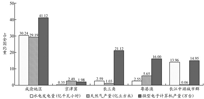 1. 拥有“扎实完备”的发展基础及产业体系近年来,成渝地区双城经济圈抢抓西部大开发、“一带一路”共建、长江经济带建设等机遇,经济社会取得长足发展。2022年实现地区生产总值77 587.99亿元,占全国的6.4%,西部的30.2%①,增长极能级稳步提升。产业体系完备,是全国工业体系最完备的经济区域之一。初步建立了以电子信息、汽车制造、高端装备、食品轻纺、能源化工、先进材料、医药健康等特色优势产业为主体,涵盖全部41个工业大类的现代产业体系。产品供给丰富,在全国统计的620种主要工业产品中生产面超八成。水电、天然气、微型计算机产量占全国的20%以上,在全国城市群中均居第一(见图 2);原盐、化学农药原药、汽车、空调、移动通信手持机产量占全国的10%以上。扎实的发展基础以及完备的现代化产业体系足以支撑成渝加快落实国家战略腹地建设。
