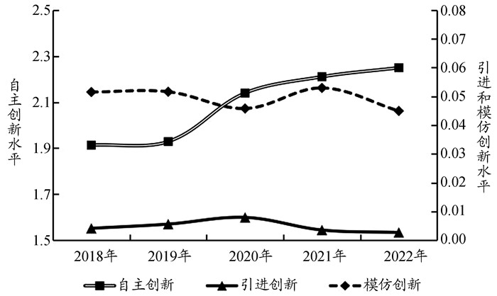 2. 支撑科技自立自强的区域创新模式尚未形成,高科技成果转化效能不强以推动强化战略科技力量支撑高水平科技自立自强实现,是国家战略腹地建设的要义,强调了区域在关键领域与核心技术上的自主创新能力。成渝地区虽已汇集较为丰富的科技创新资源,但尚未形成支撑科技自立自强的区域创新模式根据现有政策文件与学术研究,本文认为现有的区域创新模式包括自主创新、技术引进与模仿创新三类。分别采用R&D内部支出占GDP比重衡量自主创新,用引进技术经费支出占GDP比重量化技术引进,用技术改造经费支出与消化吸收经费支出之和占比表征模仿创新。。具体而言,表征地区尝试自主独立研发的自主创新水平有较为明显的提升(见图 5),但截至2022年与全国科创中心相比仍有较大差距(见图 6);而对高技术产业的技术引进与模仿创新水平均在低位徘徊,反映出当前成渝地区获取外部高技术支持进行消化吸收再创新的能力较弱。此外,就区域技术转移与科技成果转化规模水平而言,成渝地区与京津冀等地区还有显著差距,仅基本与全国平均持平(见图 7);科技成果本地转化率低,主要通过在长三角等地区进行异地转化,未能较好将“科学技术转变”同“因地制宜发展新质生产力”有效衔接。总体来看,成渝地区的高科技成果转化效能还未能对建设全国科技创新中心和国家战略腹地的战略目标起到策源驱动效应。