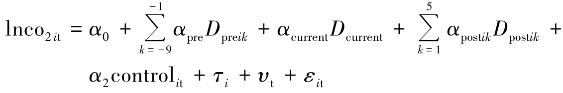 为进一步验证“宽带中国”试点政策对碳排放的时间动态效应,考虑到“宽带中国”试点政策分批实施,且在推动碳减排中可能具有缓冲期和动态持续性,故借鉴Beck等[