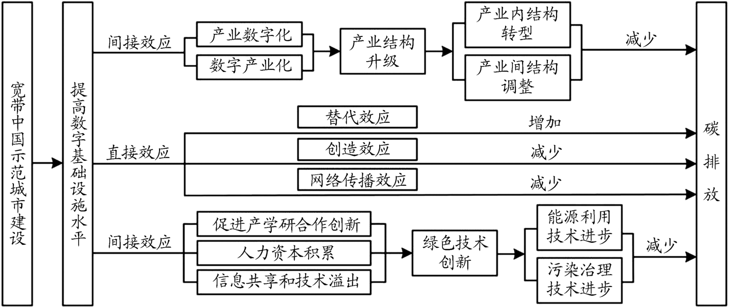 现阶段,我国数字经济正处于规模扩张和价值创造的重要窗口期,以5G、人工智能、大数据中心、物联网、工业互联网等为核心的数字基础设施正不断完善,凭借其高渗透性、规模效应及网络效应影响着经济社会等诸多领域,对企业生产方式、居民生活方式和政府治理模式产生重大影响,推动经济发展迈向高级化。与此同时,“十四五”规划和2035年远景规划纲要提出“推动能源清洁低碳安全利用,深入推进工业、建筑、交通等领域低碳转型”,党的二十大报告也再次强调了绿色低碳的生产生活方式在实现经济高质量发展中的关键作用。党的二十届三中全会提出要健全绿色低碳发展机制。在“双碳”目标与大力发展数字经济的背景下,数字技术在能源、资源和环境领域深度嵌入与应用创新,与电力、工业、交通、建筑等重点碳排放传统产业实现深度融合,为经济绿色发展提供了新动能。随着数字经济成为实现经济社会绿色转型和低碳发展的大势之趋,数字基础设施建设也上升至国家战略层面。我国自2013年实施“宽带中国”战略以来,工信部和国家发改委于2014年、2015年和2016年分三个批次评选出了120个示范城市(城市群),国家信息化水平和数字经济发展基础取得突飞猛进的进展。那么,在具体实践过程中,“宽带中国”这种渐进式的示范城市建设是否促进了城市绿色低碳的发展?主要通过何种影响路径起作用?政策效果是否具有动态持续性和空间示范效应?探讨这些问题对于数字经济时代下实现绿色高质量发展具有重要现实意义。鉴于此,本文从理论层面构建数字基础设施影响碳排放的分析框架,从产业结构升级和绿色技术创新两方面,探讨数字基础设施建设对碳排放的直接及间接影响机制,以“宽带中国”战略试点为准自然试验,将双重差分法与空间计量模型相结合,评估数字基础设施的碳减排效应、时空动态效应及城市异质性。在现实意义上,为“宽带中国”试点政策的环境效应评估提供了实证依据,在一定程度上丰富和拓展了对互联网政策生态效益的评估研究;也为进一步落实网络强国、数字中国等国家战略,深入推进数字基础设施建设,探索低碳绿色发展的新型城市发展模式和治理模式提供有益借鉴。