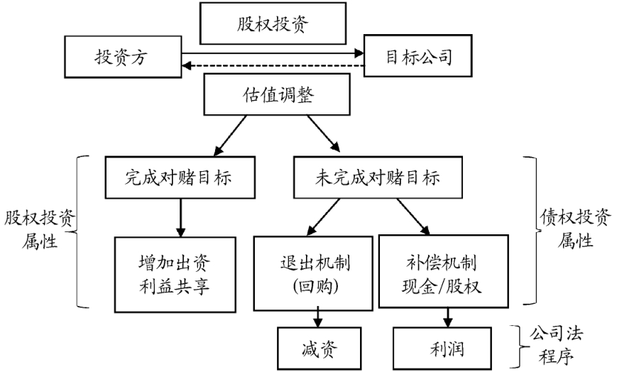 [9] 楼建波, 马吾叶. 优先股与普通股股东间利益冲突的处理原则:美国司法实践的演进及其启示[J]. 证券法苑, 2015(3): 1-31. 9 ] 。若对赌成功则公司价值上升,投资方所持目标公司股权的价值提升,双方实现共赢,投资人可能需要履行对目标公司及其原股东的激励承诺,由投资方增加投资或双方共享收益,这是投资者与目标公司的利益再次平衡;若对赌失败,投资方持有目标公司的股权价值低于其投资估值,目标公司的责任条款被激活,投资者依约对目标公司实施惩罚性利益调整安排,以最大限度止损,但最复杂也最易引起争议的交易环节即为对赌失败后估值调整机制的运行,因为这种利益调整目前在实践中分别对应公司法的减资程序和利润分配程序,容易陷入履行不能的境地。不同法律体系在对赌协议上冲突的消解无法通过效力识别方法,只能依靠利益衡量方法[