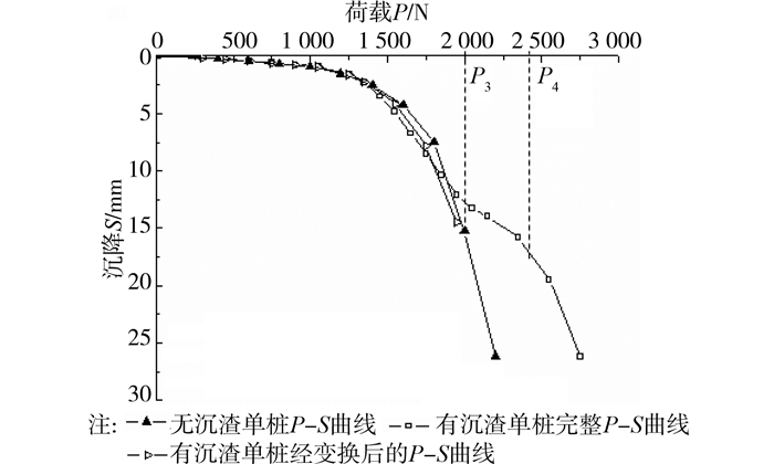 通过本文最优化逻辑将曲线进行变换后可得到的单桩正常的极限荷载P3,而桩底有沉渣的单桩极限荷载为P4,两者差量为沉渣的压实荷载量,从图 2中可以看出,对于桩底存在沉渣的桩的极限承载力在沉渣被压实后,往往比无沉渣的桩承载力更大。