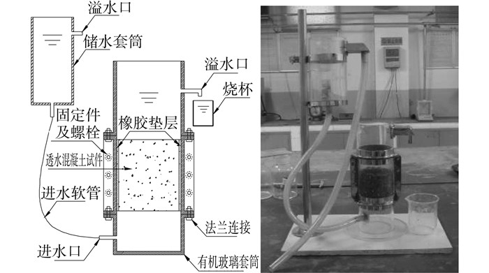 该渗透仪主体结构(如图 2所示)包括:储水套筒、进水软管、进水口、有机玻璃套筒、橡胶垫层、圆柱形试件、出水口、烧杯。其中有机玻璃套筒分为3节,用法兰螺栓连接;上下2节分别设置进水口和出水口;中间1节套筒的设计对防止侧壁渗漏至关重要,它由左右2个半套筒组成。为防止透水性混凝土试件侧漏,采用了试件侧面防水涂抹+柔性夹层+套筒刚性壁的复合结构,即:试验前用黄油或凡士林涂抹试件侧面,以封堵试件开口空隙;套筒内敷橡胶柔性垫层,这样试件与套筒间就由刚性连接变为柔性连接,进一步防止侧壁渗漏,使水的渗流路径达到图 1(c)所示的理想状态。