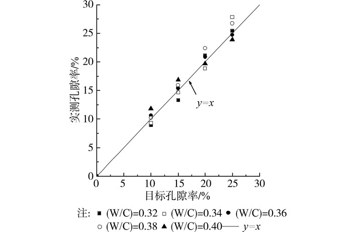 图 4所示为实测孔隙率与目标孔隙率的关系曲线。可见所有数据点均在直线y=x附近,说明实测孔隙率与目标孔隙率非常接近。其中水灰比为0.36时,实测孔隙率的点基本落在直线y=x上,说明此时实测孔隙率与目标孔隙率最为接近;水灰比为0.38时,实测孔隙率的点均位于直线y=x的上方,实测孔隙率略大于目标孔隙率。