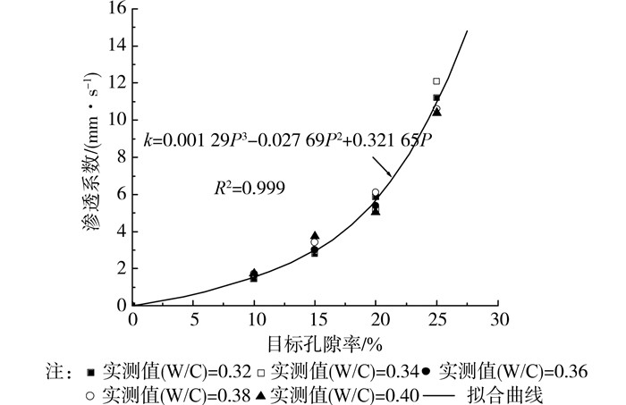 图 7所示为渗透系数随孔隙率的变化曲线。可见,孔隙率和渗透系数成正相关关系,渗透系数随孔隙率的增大而增大,且增大速率越来越快;水灰比对渗透系数的影响较小。水泥浆用量减少则孔隙率增大,混凝土内部过水孔道增多且平均孔径增大,水受到的粘滞阻力减小,这将导致水流速度加快,渗透系数增大。渗透系数与目标孔隙率的关系可用二次函数进行拟合,得到渗透性孔隙率模型,式中k为渗透系数(mm/s),P为目标孔隙率(%)。