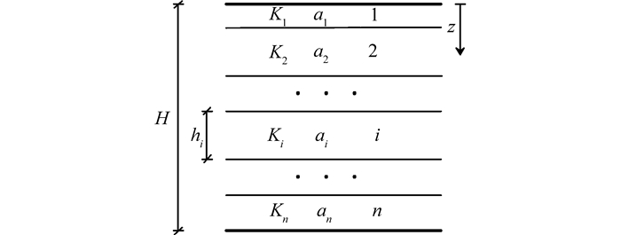 考虑实际填埋场垃圾生化降解时间随埋深增大的规律,针对填埋垃圾的分层特征提出以下气压分析模型。将填埋体分为n层,各层厚度为hi,产气速率和固有渗透系数分别为ai和Ki,如图 1所示,填埋体总厚度为H,z为垃圾埋深,第i层和第i+1层层间界面埋深为zi。各层可为具有不同填埋龄期的垃圾层、水平导气层、封顶覆盖层或中间覆盖层。