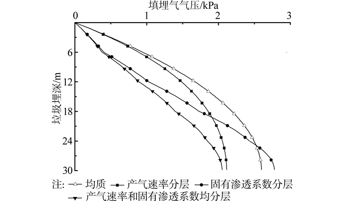 首先,采用本文模型分析垃圾分层与否对封场时填埋体内气压计算结果的影响(图 2)。若产气速率和固有渗透系数均分层取值,气压梯度在层间处具有明显变化,这是由于层间固有渗透系数不同产生的。若固有渗透系数分层取值而产气速率取各层平均值,气压梯度仍在层间处呈现明显变化,但由于产气速率取值按埋深平均后,深部垃圾产气速率高于其实际值,加上深部垃圾的固有渗透系数较低,因此填埋体底部气压明显高于产气速率和固有渗透系数均分层取值的分析结果。若产气速率分层取值而固有渗透系数取各层平均值,气压梯度无上述层间突变现象,但由于固有渗透系数取值按埋深平均后,浅部垃圾固有渗透系数低于其实际值,而浅部垃圾因填埋龄期较短而产气速率较高,因此填埋体浅部气压明显高于产气速率和固有渗透系数均分层取值的分析结果。若产气速率和固有渗透系数均取各层平均值,填埋体气压整体明显高于产气速率和固有渗透系数均分层取值分析结果,例如深度12 m处高出88%。可见,产气速率和固有渗透系数按埋深平均取值计算会显著高估填埋体内气压。本文得到的无覆盖条件下填埋体气压值与文献报道的无覆盖条件下气压计算值相近[7-8]。