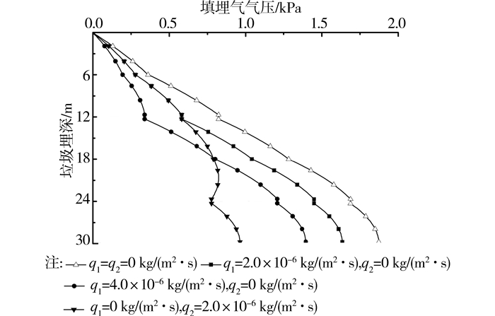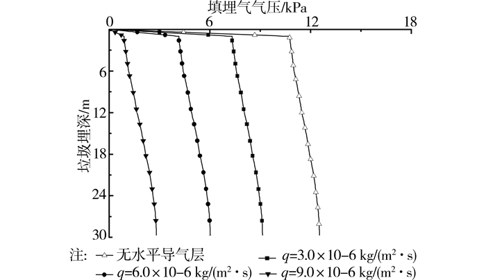 与垃圾相比,土质覆盖层固有渗透系数明显较小,假设填埋体表面设有一厚度为1 m[13, 21-23]、固有渗透系数为1.0×10-14m2[21]的土质封顶覆盖层。由图 3可见,设置土质封顶覆盖层后封场填埋体表面气压增大为10.7 kPa,该部位气压过大可影响土质封顶覆盖层稳定性。如在土质封顶覆盖层设置一厚度为60 cm、固有渗透系数为3.0×10-9m2的高渗透性水平导气层[16]。气压的减小值与水平导气层抽气速率q基本成正比例关系。当水平导气层抽气速率为9.0×10-6 kg/(m2·s)时,填埋体表面气压下降至0.9 kPa。可见,水平导气层可有效减小填埋体表面气压。填埋场工程设计中可根据土质封顶覆盖层下气压控制要求,根据本文模型分析结果指导合理选择抽气泵。