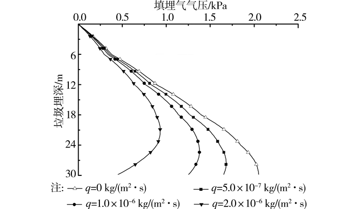 国外低水位填埋场底部渗沥液导排系统兼作填埋气导排通道[7, 17-18]。下面分析填埋体底部填埋气导排通道集气速率q对气压分布的影响。由图 5可见,填埋气气压减小值随集气速率q的增大而增大。集气速率为2.0×10-6kg/(m2·s)时,底部填埋气气压由无气体导排时的2.05 kPa下降至0.43 kPa,下降幅度为79%;而埋深12 m处填埋气气压下降幅度仅为28%。其最大气压则是由无气体导排时的2.05 kPa下降至0.93 kPa,降幅为55%,且其位置由底部上升至埋深21 m处。由上述分析可见,填埋体底部填埋气导排通道可有效减小填埋体内填埋气气压,特别是接近导排通道的深部垃圾填埋气气压。