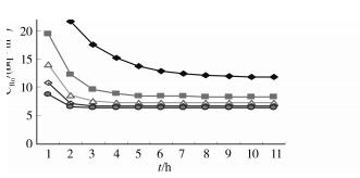 参照UNSCEAR公布的最新各种室内氡源的相关参数及标准,并利用式(1)~(5)计算与实验中的对比,我们可以得到室外空气氡浓度A、建筑材料所致氡进入率B、建筑物地基土壤氡进入率C、家用燃料的氡进入率D和供水所致氡的进入率E的相对合理值分别为5、10、29、1和0.3 Bq/(m3·h);氡的衰变常数λRn为7.6×10-3h-1。参照UNSCEAR公布的最新标准,在有地板且没有裂缝的房基土壤和建筑材料所致氡进入室内厚度通常在0.2 m[19];初始可以直接从室内测的,房间的体积和房间通风道的表面积以及空气流动速率都可以从实际生活中得到。该模型不仅考虑到自然通风,也涉及到机械通风,由于机械通风可以近似看着一个常数,在微分中不影响结果,积分后加上该常数。因此,该模型具有预测的可行性。