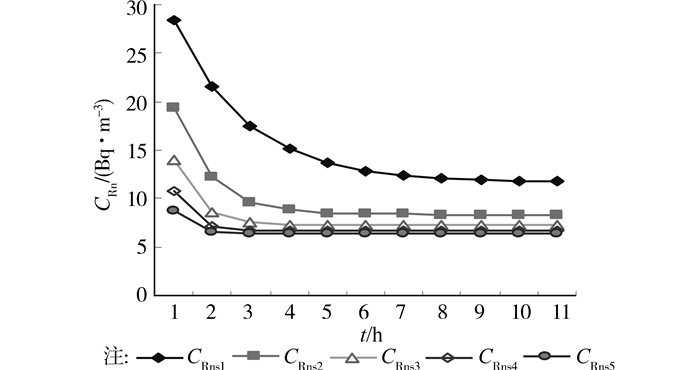 综上所述,假定室内外空气氡浓度均一混合,空气中氡的浓度一致;氡均匀地散发到房间的整个空间;送入室内的空气立即与室内空气充分混合,送风量等于排风量,则室内氡的变化可用下式描述: