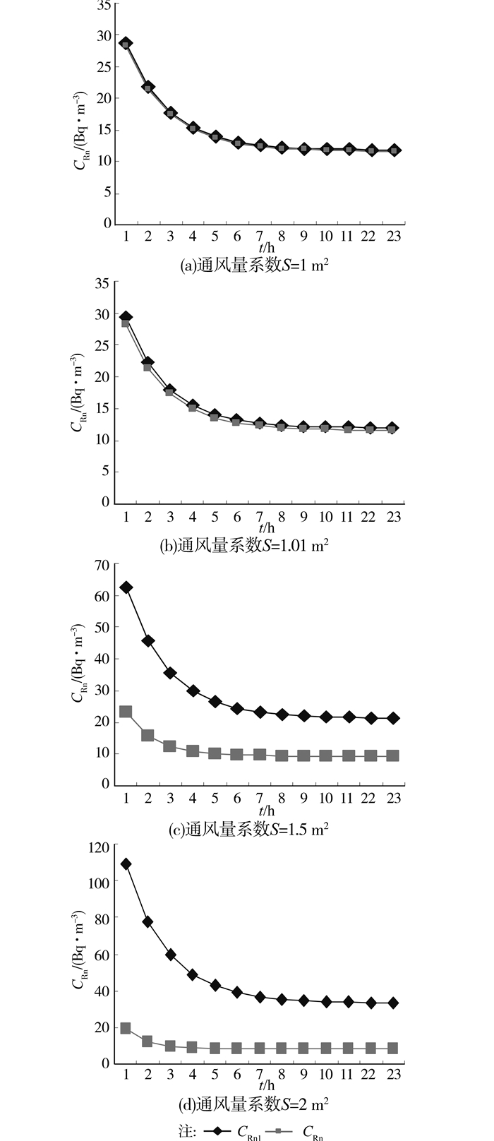 从表 2和图 2中,我们发现当房间通风时,且通风量系数S和其它一定时,室内氡浓度CRn随时间快速降低,但当时间到达一定值(拟合值t为6 h时,室内氡浓度CRn斜率变小,开始趋向于0,随着t增大,室内氡浓度最终和室外空气氡浓度趋向一致,根据方程(8)的运算和表 2数据,当t≥22 h时,CRn趋向稳定值11.66,验证了上述理论。在生活中当房间的门窗面积一定的时候,可通过增加开窗的时间来降低室内氡的浓度。我们已计算出房间室内体积为350m3,通风量系数为1 m2时,通风6 h就可以使室内氡浓度与室外趋向一致;当S为2 m2时,通风4 h就能室内氡浓度与室外趋向一致;当S为5 m2时,不超过2 h就能到达一致。从表 3中,可以发现当通风量系数S不同时,室内氡浓度CRn趋向稳定值不同,如当S=2 m2时,CRn趋向于8.36 Bq/m3;而S为5时,CRn趋向于6.35 Bq/m3。所以,该模型为房子的通风设计提供了合理的依据。