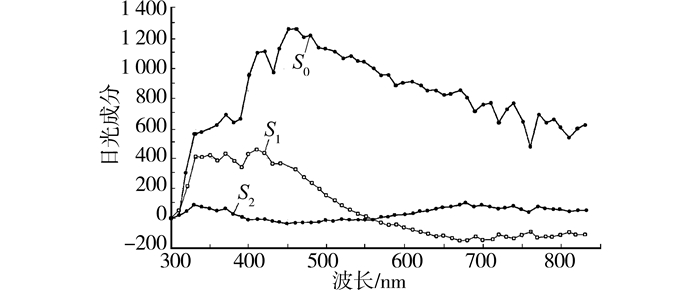 国际照明委员会(CIE)推荐了4种标准照明体A、B、C、D来规范颜色测量。典型日光(即CIE标准照明体D)在CIE1931色度图上表示为一条位于黑体轨迹上方的典型日光色度轨迹,其是由两类实验数据定出的:一类数据来自1963年Condit等人测量的622例不同地区和不同时相的太阳光和天空光光谱分布;另一类数据是同年完成的两组视觉色度测量,即Nayatani等[16]和Chambeilin等[17]分别对加拿大渥太华和英国南部的北天空日光的直接视觉观察。针对Condit等人测量的622例日光光谱分布,Judd等[18]用统计学的特征矢量分析重新组合出一定相关色温的典型日光光谱功率分布。由这622例日光光谱分布曲线可以得到1条平均曲线S0,分析这些曲线偏离S0的变化,可以找到偏离S0的最突出特征矢量S1和第2个最突出特征矢量S2,以及第3特征矢量S3和第4特征矢量S4等。一般而言,用特征矢量S1、S2和相应的乘数M1、M2就能很好地符合不同色温的日光光谱分布[19-20](图 1)。