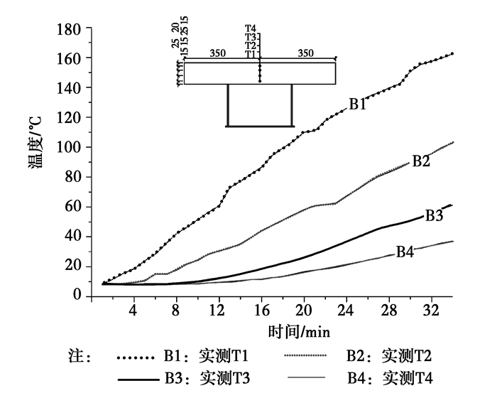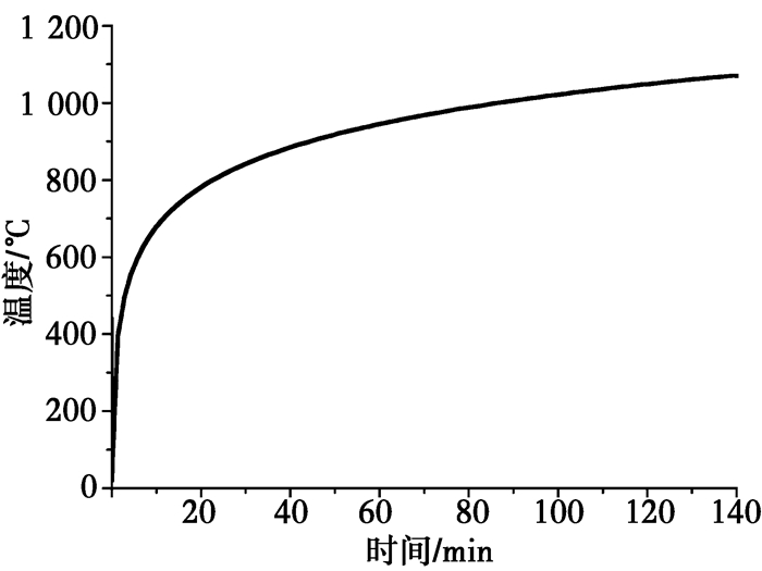 桥梁发生火灾时,火场温度决定构件内部温度,从而决定了构件及结构的耐火时间。本试验采用国际标准化组织(ISO)制定的ISO834标准升温曲线[11](图 10),并恒定荷载(升温期间作用于梁上荷载不变)升温。