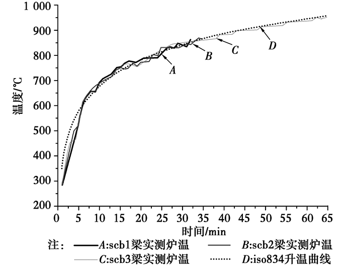 图 11所示为SCB1~SCB3梁试验时实测炉温与前述ISO834标准升温曲线的对比情况。在开始升温期间炉温与标准升温曲线相差较大,但历时较短(5 min),对构件受火试验影响不大。此后,炉内实测温度与标准升温曲线吻合较好。