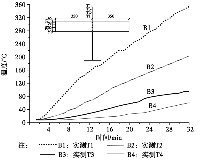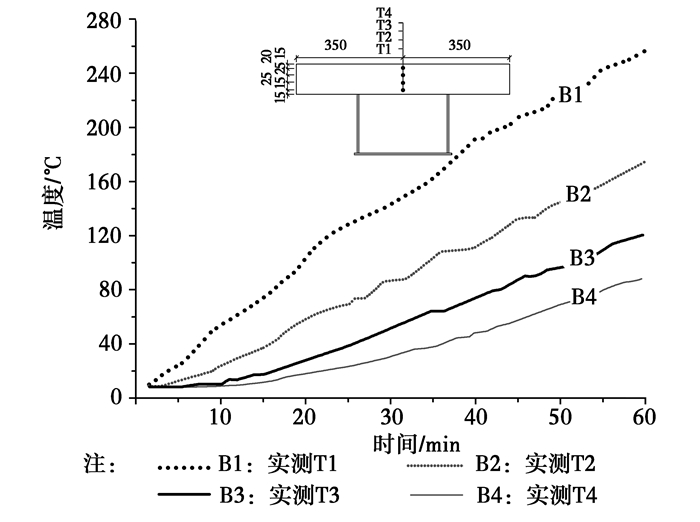 1) SCB1梁 图 12给出SCB1试验梁顶板的温度实测值。图中可以看出,试件混凝土顶板存在较大的温度梯度,靠近钢腹板的测点温度最高,受火半小时后接近360 ℃;而混凝土顶板顶部测点的测试温度较低,受火半小时不到60 ℃;越靠近钢腹板,其温度越高,反之亦然。