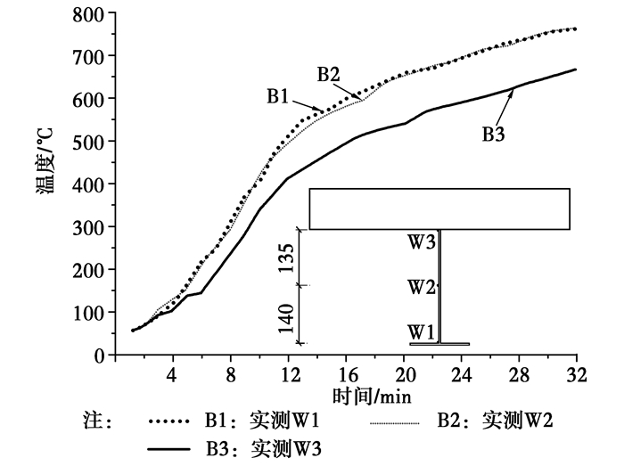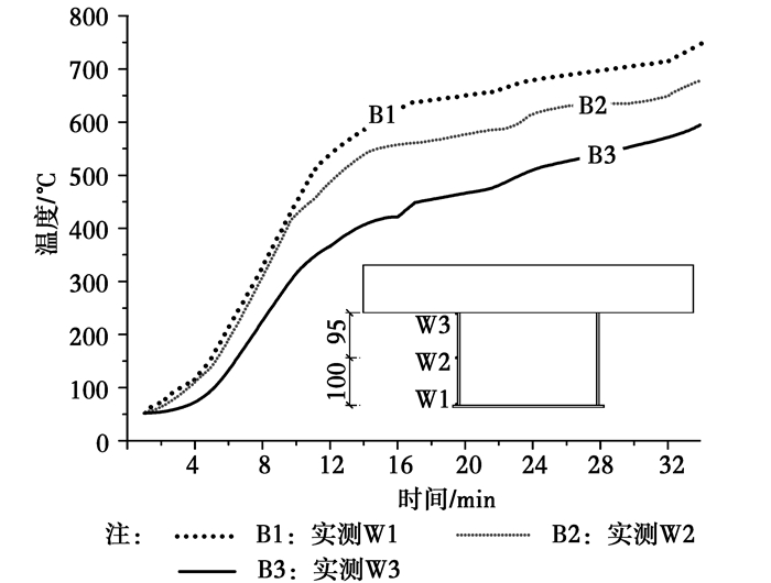 图 13给出SCB1试验梁腹板的温度实测值。整体上来说,测点温度上升速度快,而相同试验时间混凝土板温度远低于钢梁温度。腹板W1及W2测点温度值非常接近,试验结束时温度接近800 ℃。测点W3由于受到顶板混凝土的影响,其值较其他两测点温度低100 ℃左右。