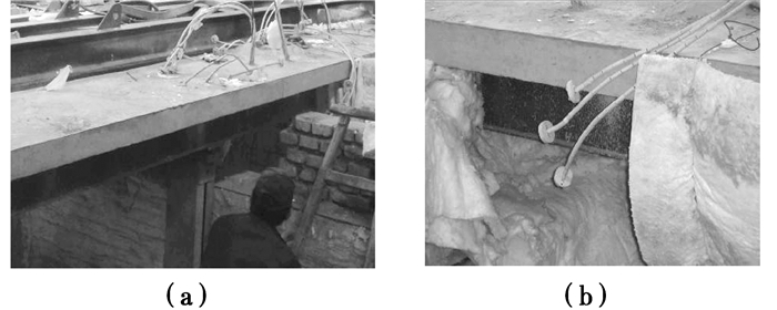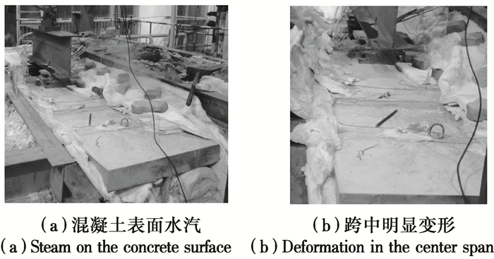 SCB1、SCB2以及SCB3梁延火时间分别为32、34以及60 min。三者受火初期随温度升高,混凝土表面产生一定数量的水汽(图 18(a)),表面呈润湿状态,混凝土板内残余水份不断蒸发。随延火时间增长,试件跨中挠度有明显增加,梁端发生较大转动(图 18(b)),最终试验梁跨中变形均超过该梁跨度的1/30,此时受火试验结束。