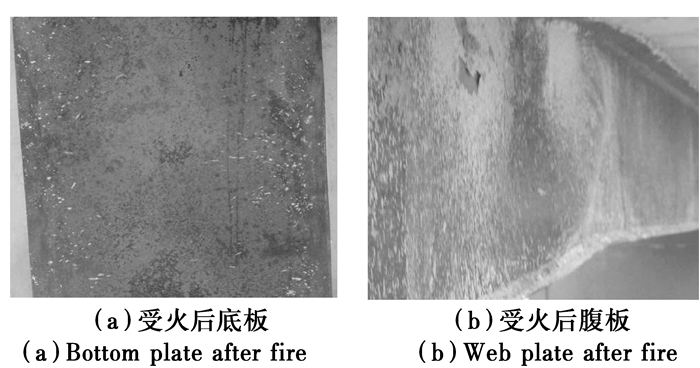 整个试验过程SCB1、SCB2梁(简支梁)顶面混凝土板均未发现裂缝,但SCB3梁(连续梁)受火节段顶面混凝土板发现明显裂缝,且随受火时间不断发展。同时, SCB3梁卸载降温后,可见受火腹板、底板钢板呈青色;中支点负弯矩区箱梁受火梁段的中横隔板附近的底板、腹板均产生明显的屈曲现象(图 19)。