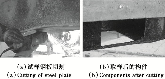 针对本次试验梁,在其制作构件时,选用与其相同批次的钢材试样留待材性对比试验;并在构件受火试验完成后,采用机械切割的方式从试件中割取钢板试样用作受火后材性试验(图 20)。