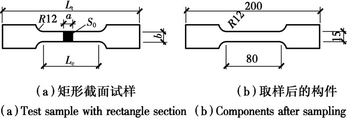 厚度大于3 mm的钢板矩形横截面试样[12](图 21(a)):Lc≥L0+1.5 S01/2。式中:Lc为试样平行长度, mm;L0为试样原始标距, mm,L0=k S01/2,比例系数k值取为5.65;S0为试样原始横截面面积, mm2,S0=a×b,a为试样厚度, mm,b为试样平行长度的宽度,mm。