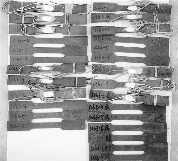 试样均以机械加工的方式进行加工,平行长度和夹持头部之间以过渡弧连接,试样头部制成适合于试验机夹持的形状,夹持端和平行长度之间的过渡弧的半径为12 mm,试样加工设计图见图 21(b)。共制作27件试验试样(图 22),试样取样情况见表 2。