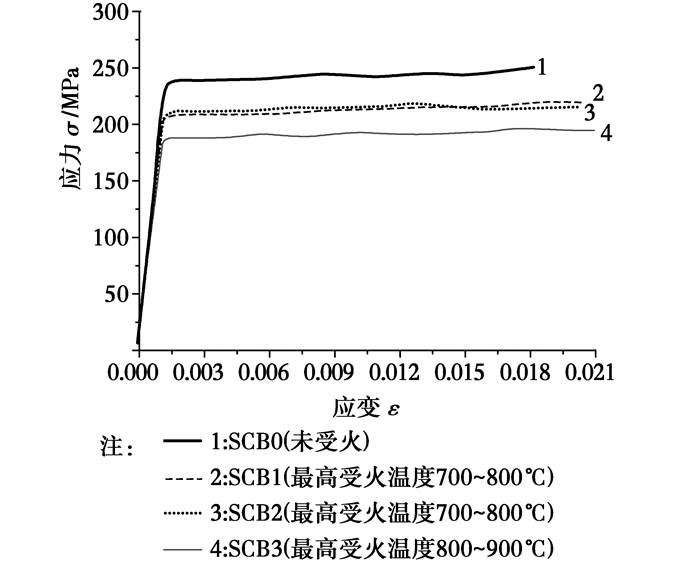 钢板材性试验主要测定受火试验前后钢材屈服强度以及极限强度。同时, 粘贴钢筋应变计,以便在试样拉伸试验时测定钢材应变,从而测定钢材的弹性模量。其中,选取SCB0-1~SCB0-3、SCB1-1~SCB1-3、SCB2-1~SCB2-6及SCB3-1底/腹~SCB3-6底/腹试样粘贴应变计。