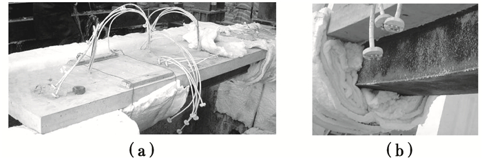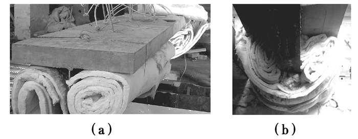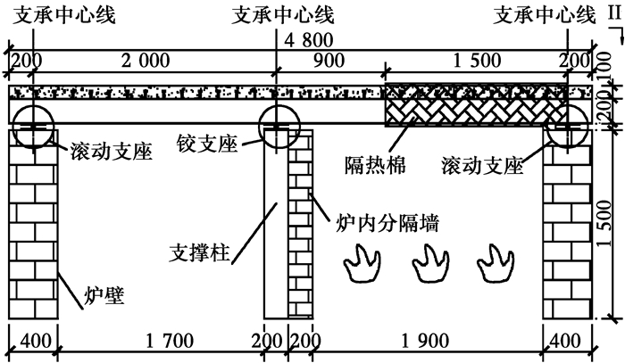 1) 火灾场景设计 设定1.4 m长的跨中部分梁段处于“三面”受火[10](梁顶面、翼缘板侧面不受火),为模拟工字形梁桥下局部受火,采用耐火隔热棉对未受火部位进行包裹隔热,支座构造为滚动简支,火灾场景模拟方案见图 2与图 3。