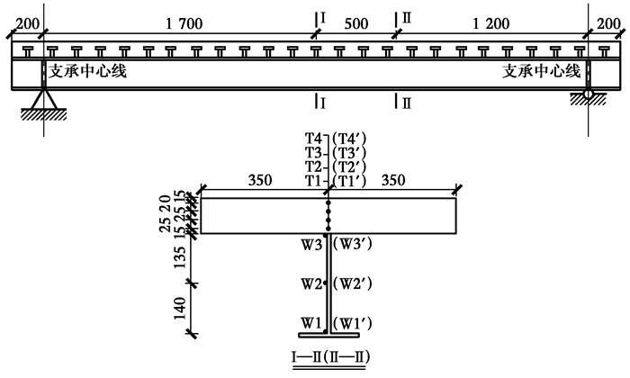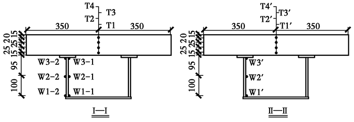 2) 温度测点布置 以跨中截面为温度场测试主截面(截面I-I),共布置10个测点。钢梁上共设置6个温度测点,其中在腹板内侧设置3个测点(W1-1~W3-1),在腹板外侧相应位置设3个测点(W1-2~W3-2);混凝土板共设置4个测点(T1~T4)。