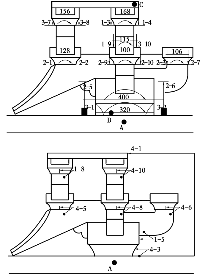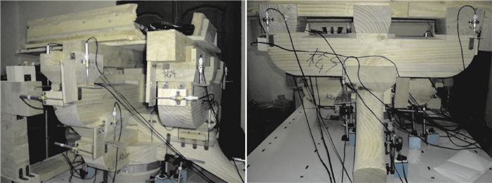 斗拱试件组装完毕后,在栌斗处由定制铁箍固定在振动台上,如图 1所示。在台面、栌斗底部和斗拱组顶部分别放置横向加速度传感器,将采集信号传送到振动台抗震抗剪测试分析系统。分别在栌斗、华拱连下昂的连接节点两侧布置竖向位移传感器测定其竖向绝对位移,在模型各层其他构件之间沿振动方向两侧布置竖向位移传感器测定其竖向相对位移;在栌斗底端及慢拱顶部布置横向位移传感器分别测定斗拱底部和顶部的水平绝对位移;其他构件连接处布置横向位移传感器测定各结构层间及斗与拱的相对位移。测点位置参见图 2。通过测定斗拱各构件在振动过程中的水平及竖向位移变化,逐层计算叠加得到各构件回转变形及滑移变形值。