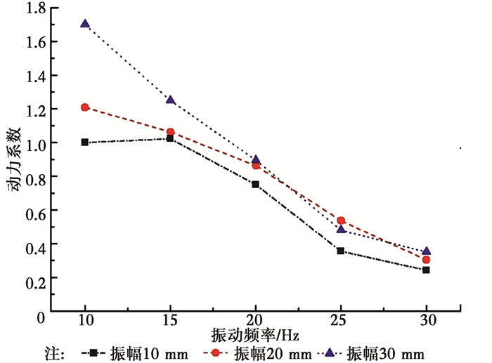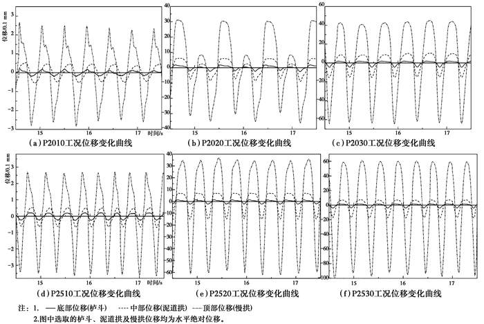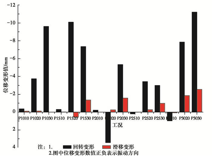 由表 4可知,通过水平滑移和回转位移的叠加求得的最大变形值与最大变形实测值基本吻合,说明本试验中采用的叠加计算方法是合理的;进一步将各工况下滑移变形和回转变形值进行对比,结合图 7可以看出,最大位移的取得以回转变形位移为主;在低频状态下(1.05~1.59 Hz)随振幅增大回转变形位移明显增大,滑移位移始终较小;在频率上升至2.10~2.65 Hz时,回转变形位移值有所降低,且当振幅由20 mm升至30 mm时,回转变形位移几乎不变,滑移位移随振幅增大而逐渐增大;在高频状态(3.12 Hz)下随着振幅增大回转变形位移有较大幅度增长,并在P3030工况达到最大值;滑移位移的变化趋势基本未变。以上分析说明在振动过程中频率的变化对回转变形的变化程度起到重要作用,而对滑移位移的影响相对较小。