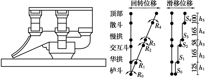 各工况下,斗拱组整体最大变形实测值、最大变形时刻与对应变形叠加值见表 4。变形最大测量值指固定在斗拱组顶部的水平位移传感器测得的最大绝对变形值;最大变形叠加值为变形最大测量值相应时刻斗拱各层构件回转变形与滑移变形叠加获得。滑移位移和回转位移的叠加原理如图 6所示。