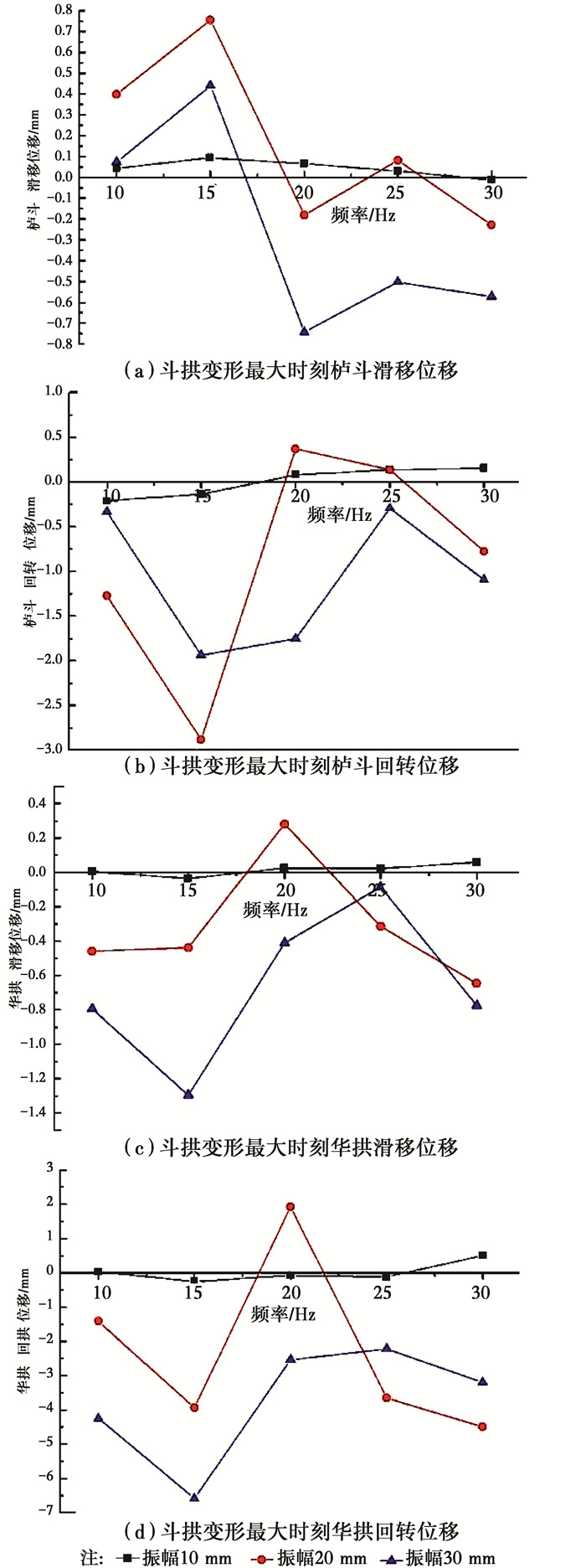 3) 振幅是决定斗拱各构件水平向滑移峰值的主要因素;在振动过程中频率的变化对回转变形的变化程度起到重要作用,而对滑移位移的影响相对较小。