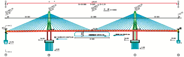 目前,中国已完成的斜拉桥换索工程中,通常由换索施工与调索施工两个阶段组成,其中换索设计目标较为统一,即基本遵照新旧索等索力代换原则[2],新索的下料长度计算需要有较为准确的旧索索力数据,才能保证新索无应力索长计算的准确。中国《公路桥梁加固施工技术规范》中指出,斜拉桥的换索施工宜采用限载、限量、限速措施确保施工过程安全,不宜中断交通[3],因此,在换索设计中需要准确评估索塔、主梁构件实际受力情况,以确定上述三限措施。为此,有必要建立准确的斜拉桥换索施工前的初态模型,以对桥梁实际受力状态有一个相对明确的分析判断。