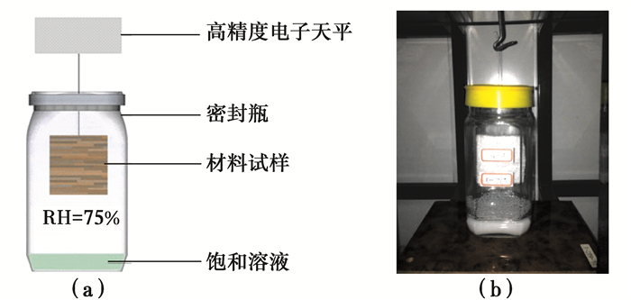 试件的尺寸均为60 mm×60 mm×9 mm。实验采用湿杯法(Cup Method)[10],以装有饱和盐溶液的密封瓶为基本设置,通过两种饱和盐溶液来维持密封瓶内的相对湿度(相对湿度33%的氯化镁饱和溶液和相对湿度75%的氯化钠饱和溶液)。实验装置的基本构成如图 1:
