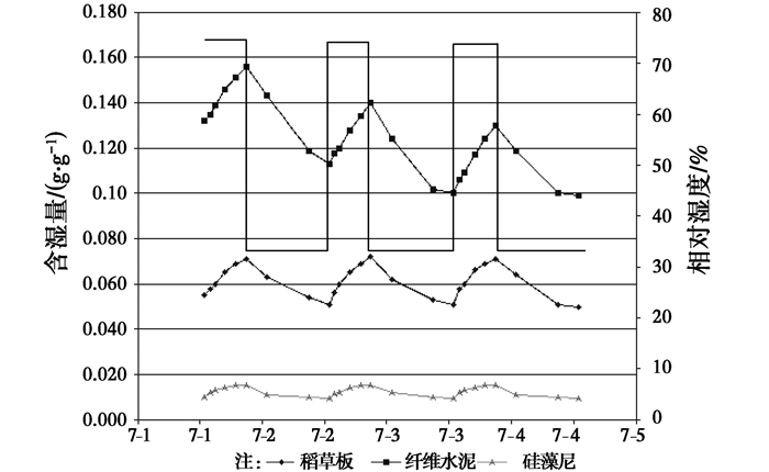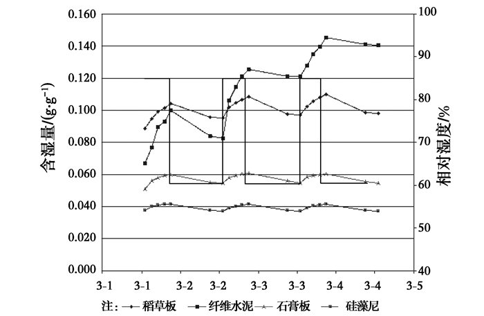 稻草板和硅藻泥在3个周期内的含湿量变化趋势稳定,呈周期性循环,且每个循环的吸湿量和放湿量基本维持平衡;纤维水泥板的吸放湿循环呈阶梯状递减趋势,吸湿量明显高于放湿量。