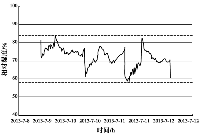 图 3较为清晰地呈现了热湿气候下(图中截取了7月8日到7月12日5 d内的数据作为典型代表)住宅室内相对湿度的变化情况。由图表和数据可知:南京地区在梅雨季节室内相对湿度波动较为明显,相对湿度变化区间为60%至85%,平均相对湿度为75%,属于典型的高温高湿气候。