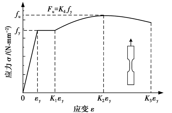式中:Es为钢材弹性模量、fy为屈服应力、K1为材料强化段起始应变与屈服应变之比、K2为峰值点应变与屈服应变之比、K3为极限应变与屈服应变之比,K4为峰值应力与屈服应力之比。