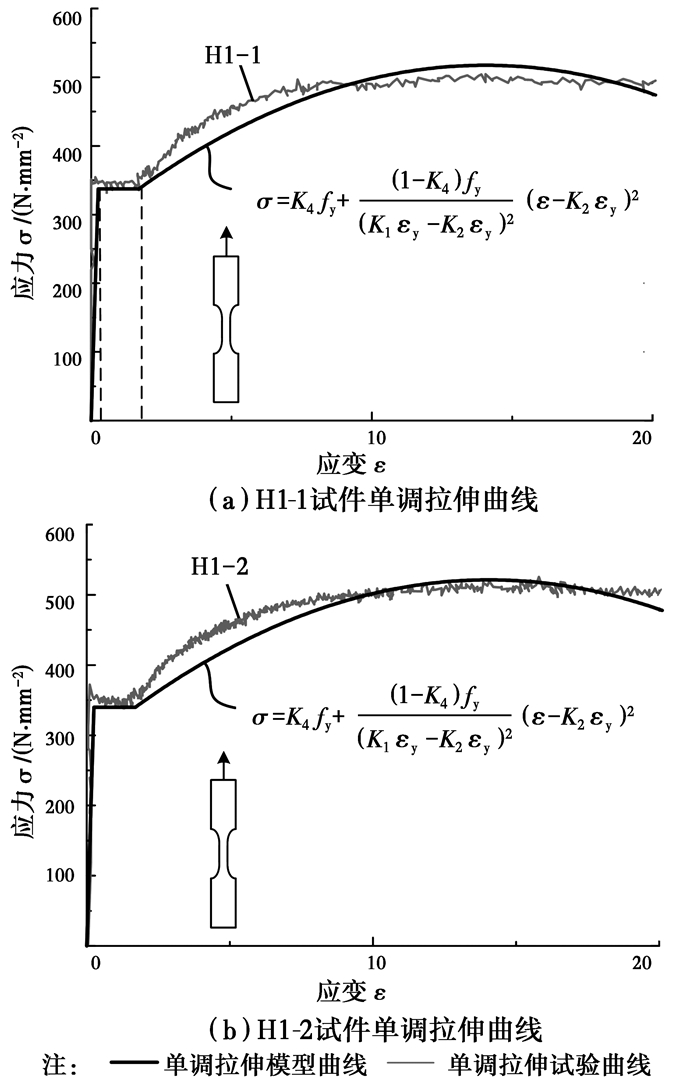 根据王元清等[4]对SN490B钢材的材性试验数据运用Origin8.5自定义曲线功能进行拟合,整理计算所得模型各参数如表 1所示。